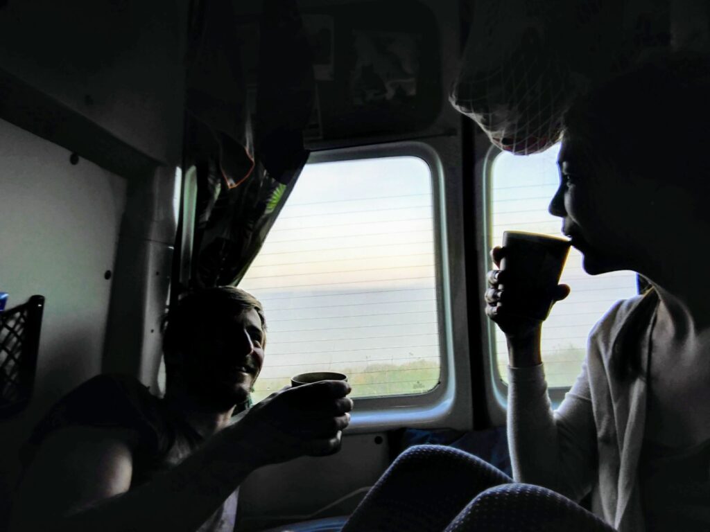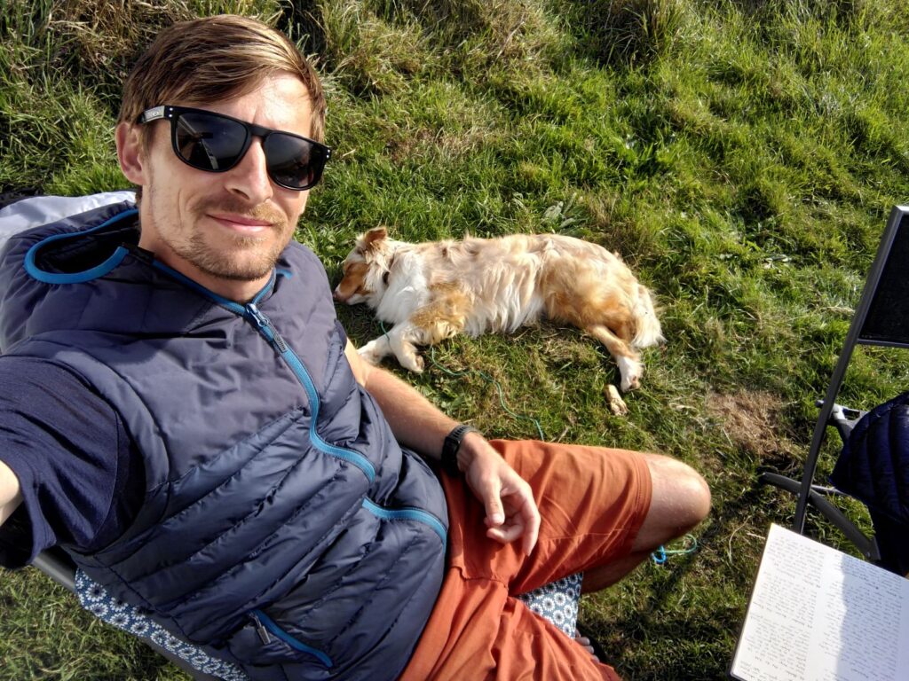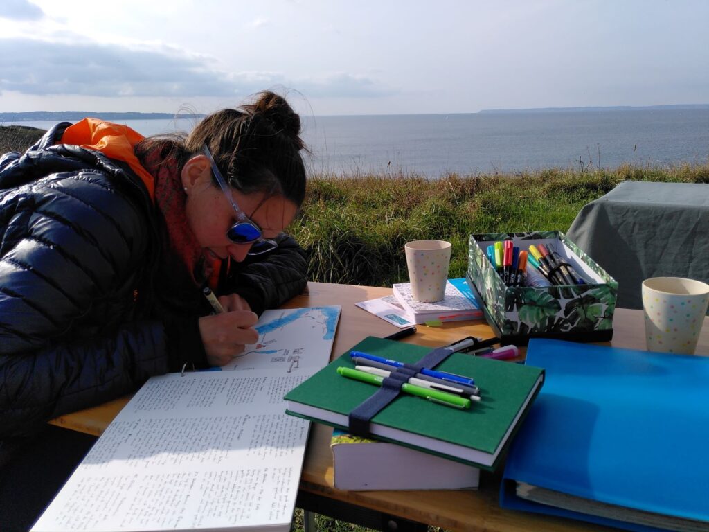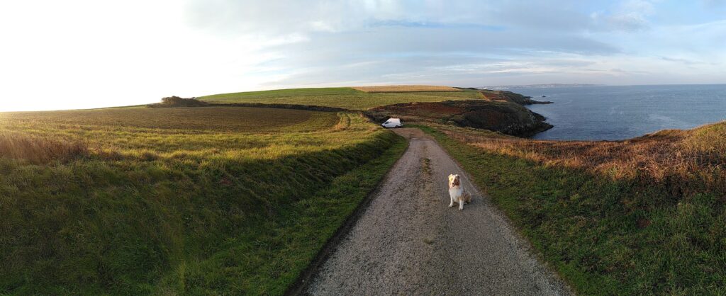 Umso breiter war unser Grinsen deshalb, als wir an diesen idyllischen Fleck gelangten. Wunderschöne Stimmung am Abend, Sternenhimmel in der Nacht, kräftige Farben am Morgen, vor uns die weite Bucht und, abgesehen von wenigen Wanderern auf dem nahen Küstenweg, kein Betrieb. Ein Platz, wo wir die Seele baumeln lassen konnten, die Küste entlang wanderten, Tagebucheinträge nachführten und den Kaffee am Morgen mit Meeresblick schlürfen konnten. Ok, es war noch kalt und die Hecktüre blieb zu.