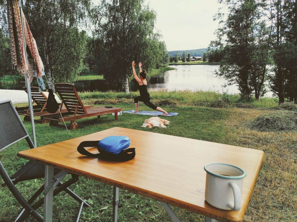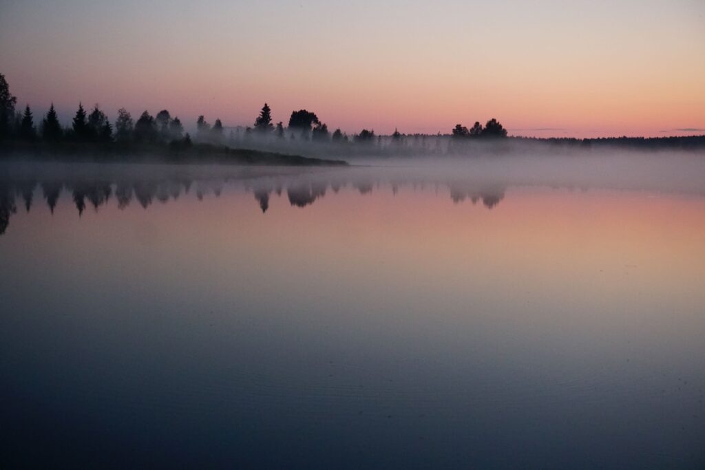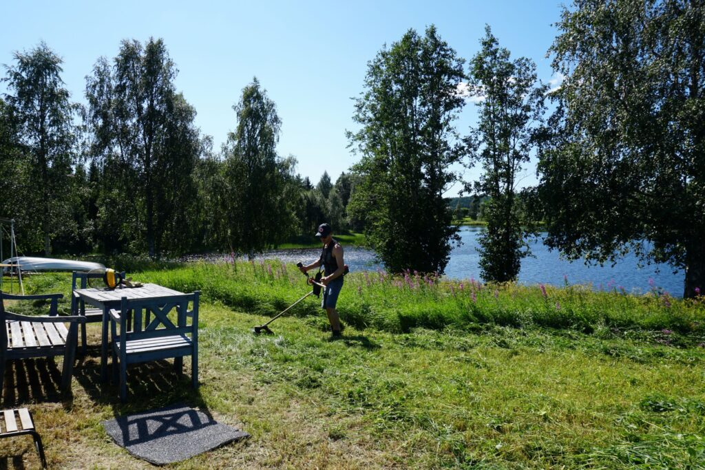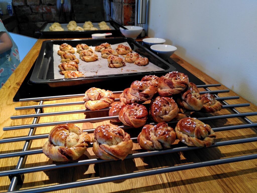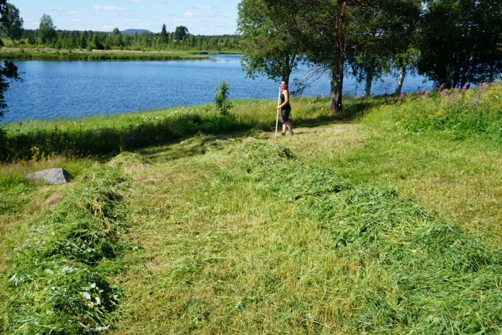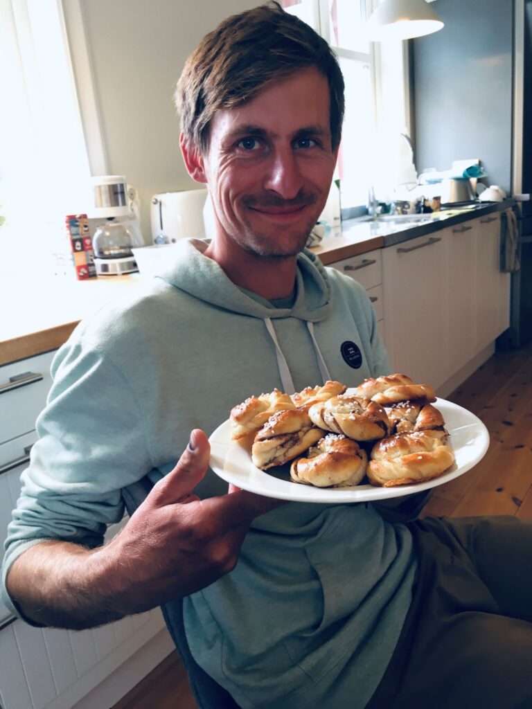 Unser Tagesablauf pendelte sich so ein, dass wir jeweils frisch gemahlenen Kafi aufkochten und die Morgenstimmung am Fluss genossen. Danach Training mit Mojo, Zmörgele und Loslegen mit der Arbeit. Dazwischen gab es tägliche Physio für das Knie von Tomas und die Schulter von Maria. Um ungefähr 16:00 Uhr durften wir uns zu Tisch begeben für ein frühes Znacht mit der Familie. Tomas ist ein grandioser Koch, Maria eine begnadete Bäckerin und wir assen fürstlich. Überhaupt war es ihnen beiden ein Anliegen, uns viel über die lokalen (Ess-)Gewohnheiten beizubringen. So assen wir Långfil, eine zähflüssige Art fermentierter Milch, welche es nur in der Gegend von Norrbotten noch zu kaufen gibt. Man kann diese Bakterienkultur auch weiterzüchten, mal sehen wie lange sie uns noch begleitet… Weiter durften wir Lachs in diversen Zubereitungsarten testen, wir assen Palt – aufwändig in Salzwasser gekochte Kartoffelkugeln – und als grandioses Highlight gab es mehrmals selbstgebackene Kanelbullar, welche alles übertrafen, was wir in den letzten Monaten an Süssgebäck getestet hatten – jättegott!!