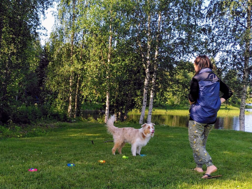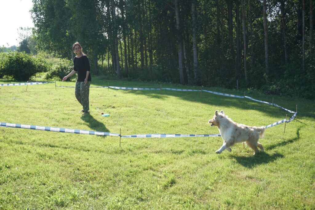 Wir genossen den immer toller aussehenden Umschwung und fühlten uns darauf so wohl, dass wir erst nach einer Woche die Farm erstmals verliessen. Auch Mojo hatte so viel Platz und spannende Ecken auf der Farm, dass er jeweils gar nicht mehr gross Spaziergänge brauchte. Er „half“ bei all unseren Arbeiten mit und war als Hütehund sowieso stets an vorderster Front mit dabei. Zu sehen, wie er sich in seinem temporären Revier genüsslich im Rasen wälzen und im Fluss herumwaten konnte, war sehr schön anzusehen. Das Herumreisen und immer wieder neue Auskundschaften ist anstrengend für ihn, das ist uns bewusst. Auch für ihn war diese „Auszeit vom Nomadenleben“ also eine willkommene Abwechslung. Zudem trainierten wir endlich wieder ausgiebig und auf perfektem Terrain. So konnten wir auf dem schönen Rasen erstmals wieder einen grösseren Longierkreis abstecken oder Mojo eine lange Fährte legen.