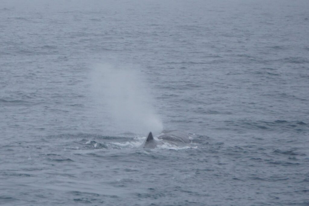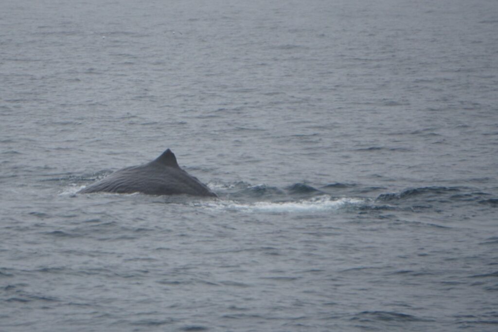 Und da sahen wir ihn plötzlich: den dunkelgrau glänzenden Rücken eines Wals. Der Kapitän steurte das Schiff leise bis auf etwa 60m an den im Wasser dümpelnden Giganten heran. Ein magischer Moment – alle Passagiere wurden still und man hörte, wie sich die kleinen Wellen am Körper des 15-20m langen Tieres brachen. Ab und zu zischte es und der Wal liess eine Gischtfontäne aufschiessen.