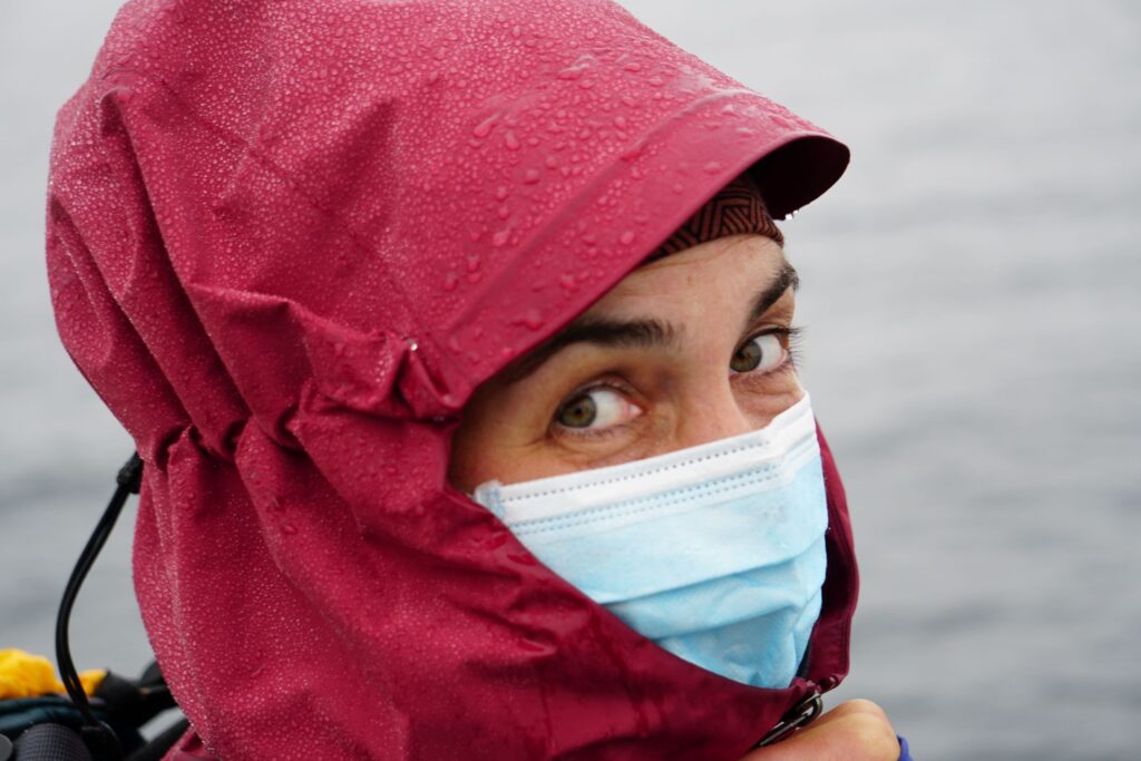 Etwa 20km fuhren wir danach aufs Meer hinaus. Dick eingepackt in Regen-Vollmontur suchten wir uns ein windgeschütztes Plätzchen und schon nach kurzer Zeit waren wir froh um jede einzelne Schicht. Diverse Mitreisende unterschätzten den Windchill und schlotterten nach kurzer Zeit in feuchten Jeans und durchnässten Faserpelzen. Als das Schiff dann plötzlich verlangsamte, waren die klammen Finger und zitternden Muskeln bei allen vergessen. Allerdings nur kurz, denn ein lässiger Speaker informierte uns Safaritouristen, dass es keinen Grund gäbe, auszuflippen. Es stehe keine Walsichtung bevor, der Kapitän drossle den Motor nur, um die Klickgeräusche des tief unter uns jagenden Wals besser hören zu können. Also, abwarten und weiterschlottern!