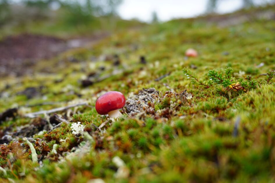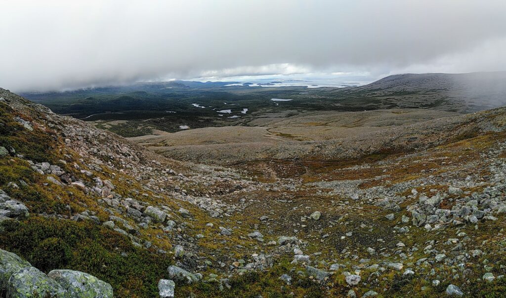 Ganz mit leeren Händen sind wir dann doch nicht aus der Finnmark weggereist, denn mit dem Naturpark Stabbursdalen haben wir eine wahre Perle gefunden. Der Parkeingang liegt etwas versteckt, einige Kilometer von der Hauptstrasse über eine holprige Schotterstrasse erreichbar, am Eingang des breiten Tals. In diesem Tal, sowie in den Nebentälern und selbst in den kleinsten Furchen der Hügel finden Pflanzen und Tiere geschützte Lebensräume vor, wohingegen es auf den exponierten Bergrücken steinig ist und sich nur wenige hartgesottene Pflänzchen halten können. Es fühlte sich an, wie eine Oase zu betreten und nebst den zahlreichen halbwilden Rentieren begegnete uns auf unserer langen Wanderung nur gerade ein Mensch. Den Gipfel mussten wir uns wirklich verdienen, denn es war eisig kalt, immer wieder nass und die rutschigen Steine verlangten uns einiges ab. Mojos Nase musste wegen den spannenden Rentierdüften auf Hochtouren schnüffeln und auch für ihn war das Gelände schwierig – dementsprechend war er am Ende dieser langen Tour komplett bedient und gaga.