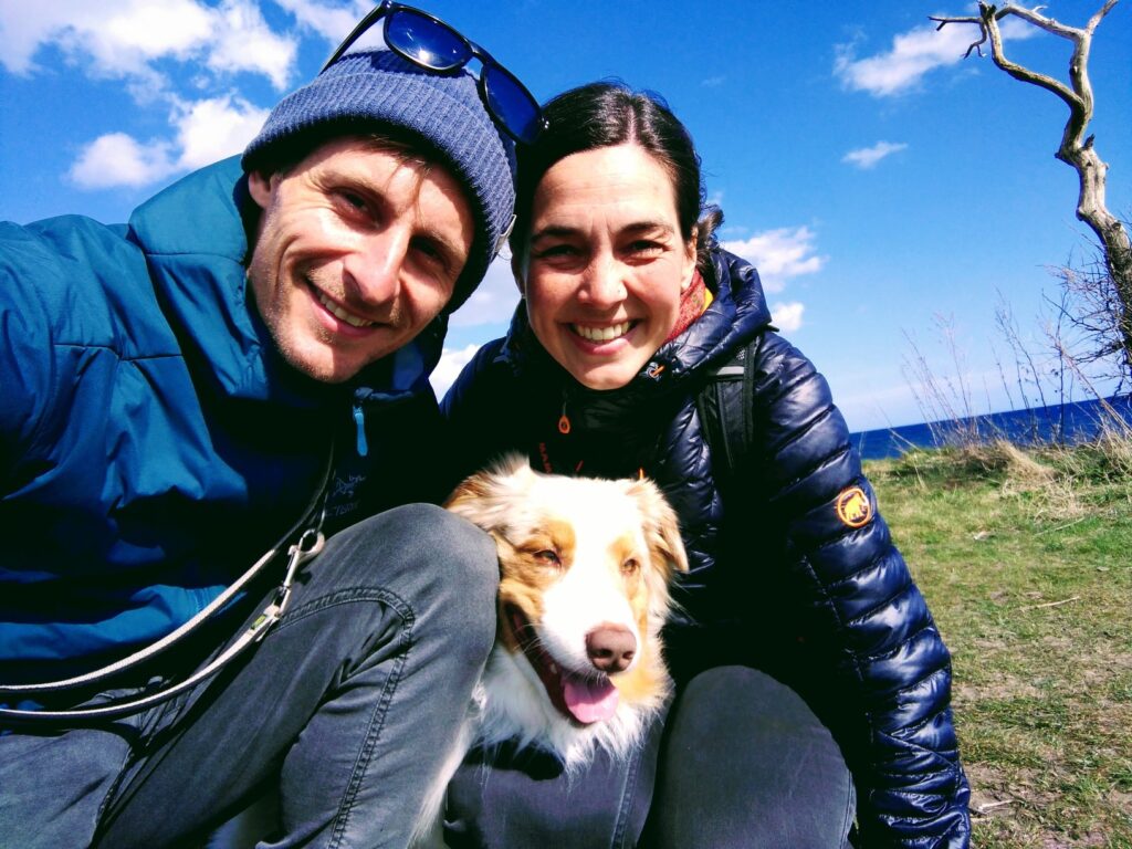 In Rostock angekommen, schlenderten wir gemütlich der Hafenpromenade entlang. Kaffee schlürfend setzten wir uns auf eine Bank und beobachteten, wer da sonst noch so herumspazierte. Da kamen zwei strahlende Gesichter auf uns zu, die wir bestens kannten. Nach Monaten ohne Begegnungen mit uns bekannten Menschen, hatte Mojo eine ziemlich lange Leitung. Als er nach einigen Sekunden begriff, wer da vor ihm stand, war die Freude plötzlich riesig. Lautstark zappelnd begrüsste er die beiden und sie zappelten freudig zurück. Anstelle der geplanten gemeinsamen Reisewochen mit ihnen dauerte unser Zusammensein halt nur wenige Stunden, aber es war trotzdem sehr schön und wohltuend.