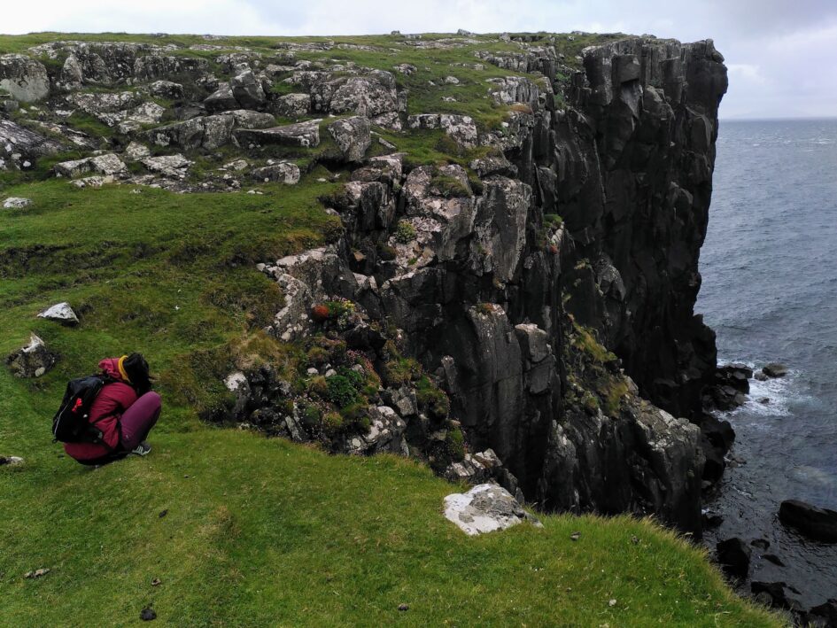 Zwei Nächte verbrachten wir in einem abgelegenen Winkel im Süden der Insel. Der Wind blies in diesen Tagen so stark, dass man sich richtiggehend schräg dagegen stemmen konnte. Die ersten Gipfel des Cuillins-Gebirges erhoben sich neben uns. Diese dunklen Formationen waren spärlich bekleidet, auf den ausgesetzten Flanken wächst nur robustes Gras und Gebüsch. Der Wind hielt uns permanent die Kriebelmücken vom Leib und der fehlende Handy-Empfang machte das Tal für viele Besucher uninteressant – kurz: für uns passte es!