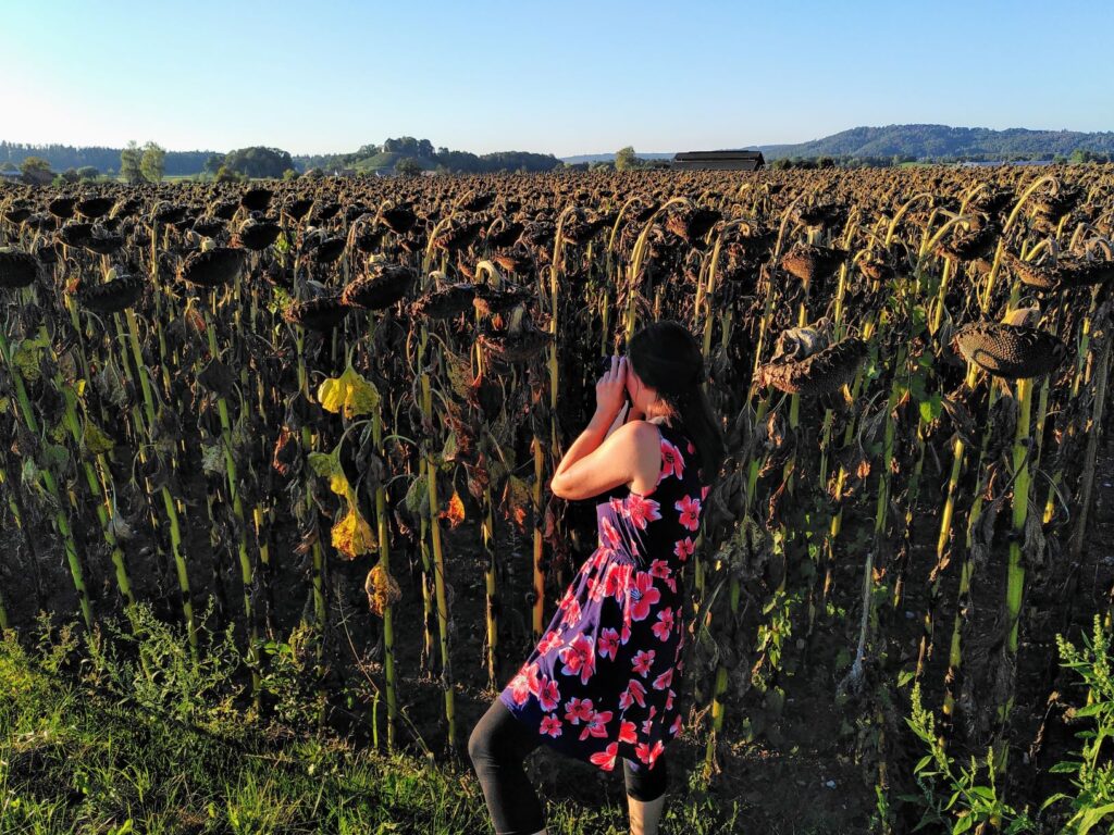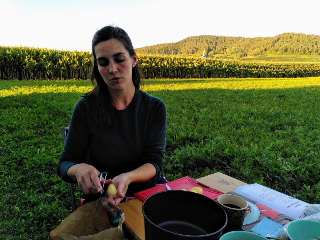 Im Norden der Schweiz, genauer im Zürcher Weinland, verbrachten wir noch eine Nacht auf dem Hof der Familie Reutimann, die in Stammheim mit viel Kreativität und Leidenschaft Produkte aus Hopfen herstellt. Die äusserst sympathische Art, wie wir dort willkommen geheissen wurden, förderte unsere Kauflust im Hofladen und in der Besenbeiz. Wer sich mal in diese Region verirrt, sollte um diese Adresse keinen Bogen machen! Wir hatten Glück und die eindrucksvollen Hopfenpflanzen leuchteten kurz vor der Ernte im goldenen Licht der Abendsonne und präsentierten ihre prallen Blüten, während nebenan die Sonnenblumen ihre Köpfe hängen liessen, so als ob sie nicht damit zurecht kämen, dass ihnen der Hopfen die Show stiehlt.