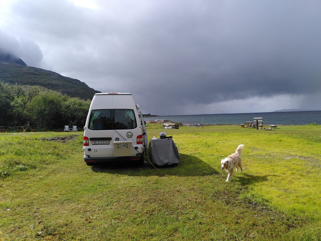 Einige Tage verbrachten wir nahe Kjerringøy, etwas nördlich der Stadt Bodø. Hierhin verirren sich nur wenige ausländische Touristen, was vermutlich mit der grossen Anziehungskraft der Lofoten zusammenhängt, welche wir zwischendurch mystisch und schemenhaft am Horizont erblickten. „Unsere“ Küste war ebenfalls atemberaubend schön. Eingebettet zwischen steil aufragenden Felswänden und dem kraftvollen Meer genossen wir drei Tage ganz alleine auf einem kleinen, von den Einheimischen schön hergerichteten Stellplatz. Wir wanderten im Regen, genossen die Geborgenheit vor Wind und Wetter im Bus und übten uns als Selbstversorger.