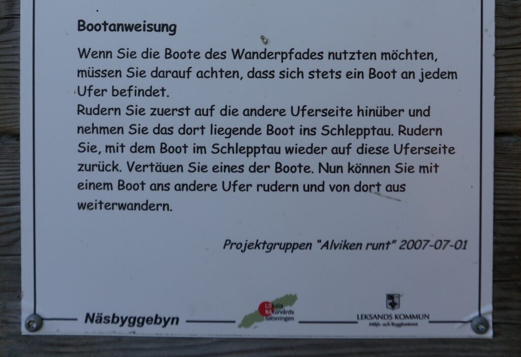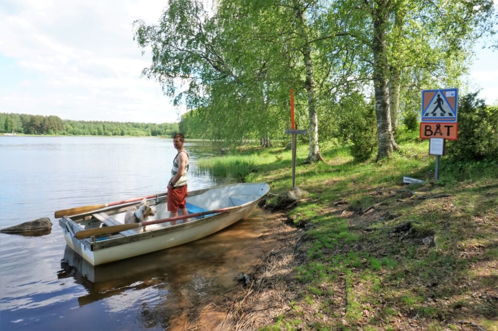 Auf einer Wanderung führte ein Teilstück über Wasser, auf der Karte eingezeichnet mit Ruderboot. Wir fragten uns, wie das wohl gehen würde. Wartet ein Fährmann auf uns? Hat es ein Boot zum selber paddeln? Was macht man, wenn dieses auf der „falschen“ Seite liegt? Die Schwedische Lösung sieht so aus: Man paddelt die Strecke anstatt einmal gleich dreimal. Zuerst wird das andere Boot geholt, bevor man erneut rüberpaddelt und weiter wandert. Das ist mal so richtig entschleunigend!