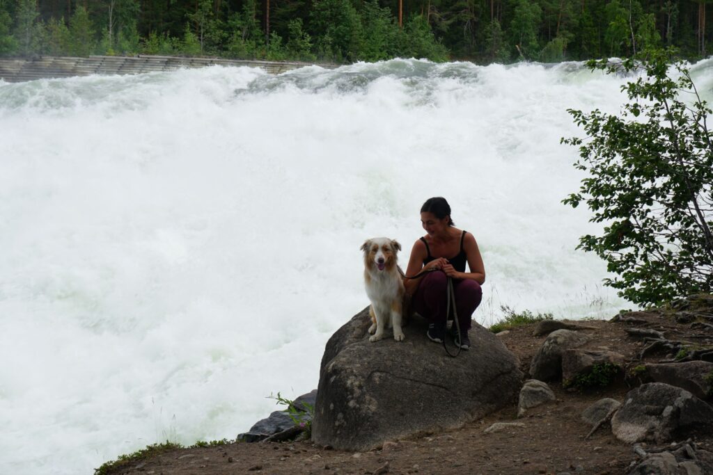 Bei Trollforsen fliesst das Wasser in einem Haupt- sowie einem ruhigen Nebenstrom durch. Letzterer ist sehr idyllisch und beliebt bei Fliegenfischern und Kanuten. Mojo genoss die Wanderung am Wasser sichtlich und kühlte sich dankbar alle paar Meter ab, denn es war hier bei unserem Besuch drückend heiss.