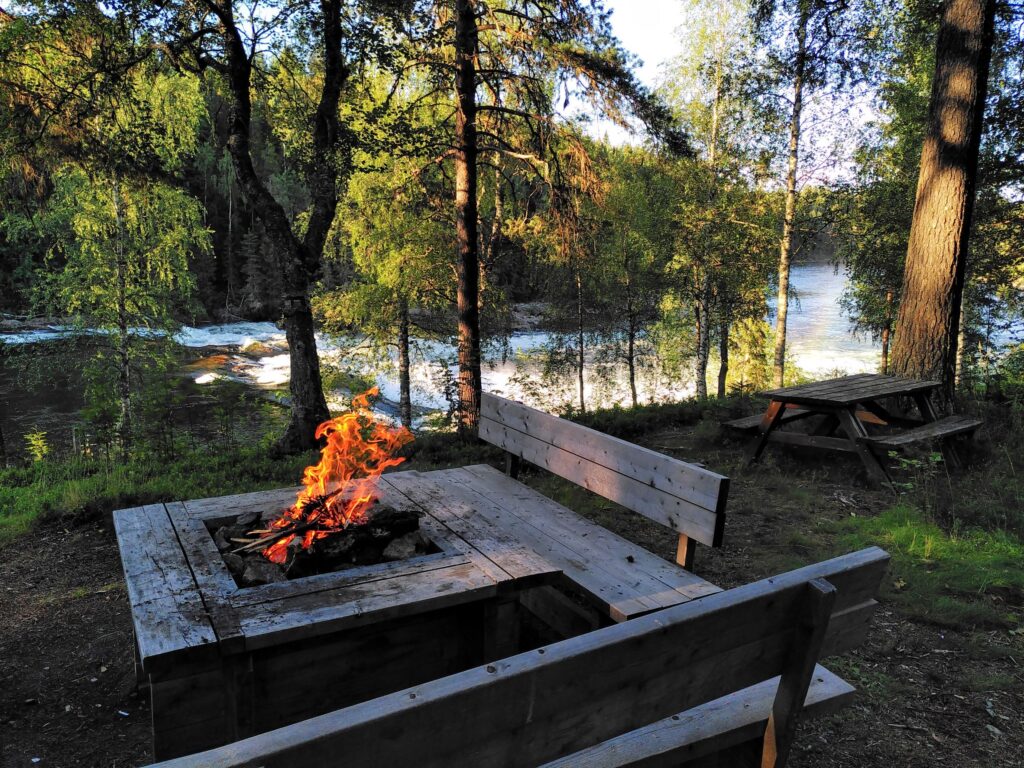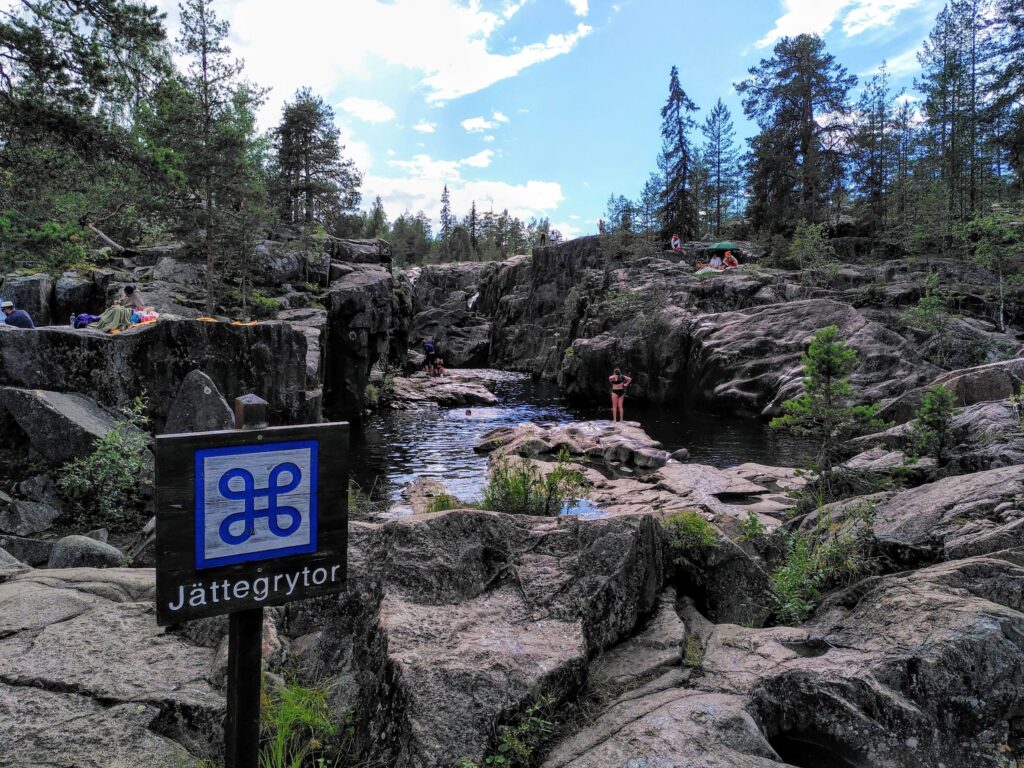 Beim Storforsen hingegen ist baden keine gute Idee. Zumindest nicht im Hauptlauf. Die Wassermassen donnern hier spektakulär und mächtig hinab, 250 Tonnen Wasser stürzen hier pro Sekunde die 60 Meter Höhenunterschied hinunter, was diese Stromschnellen zu den grössten von ganz Skandinavien macht. Daneben liegt jedoch ein trockenes Flussbett mit praktisch stehenden Naturpools. Hier badet Schweden. Dutzende Grillstellen, Picknicktische und sogar eine Openair-Bühne sind passend in das Gelände voller Felsstufen eingepasst worden.